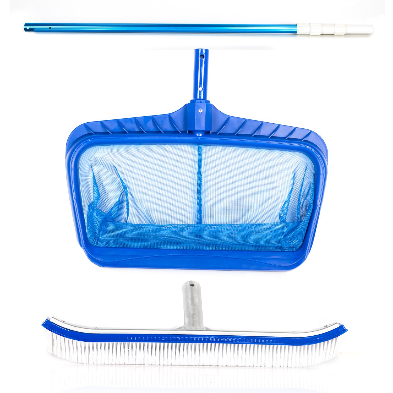 - A full set of pool cleaning equipment, featuring a telescopic pole with a leaf scoop and brush attachment
